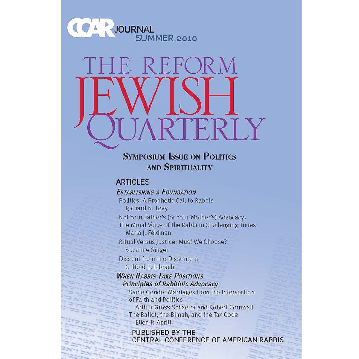 CCAR Journal - Summer 2010: Symposium Issue on Politics and Spirituality