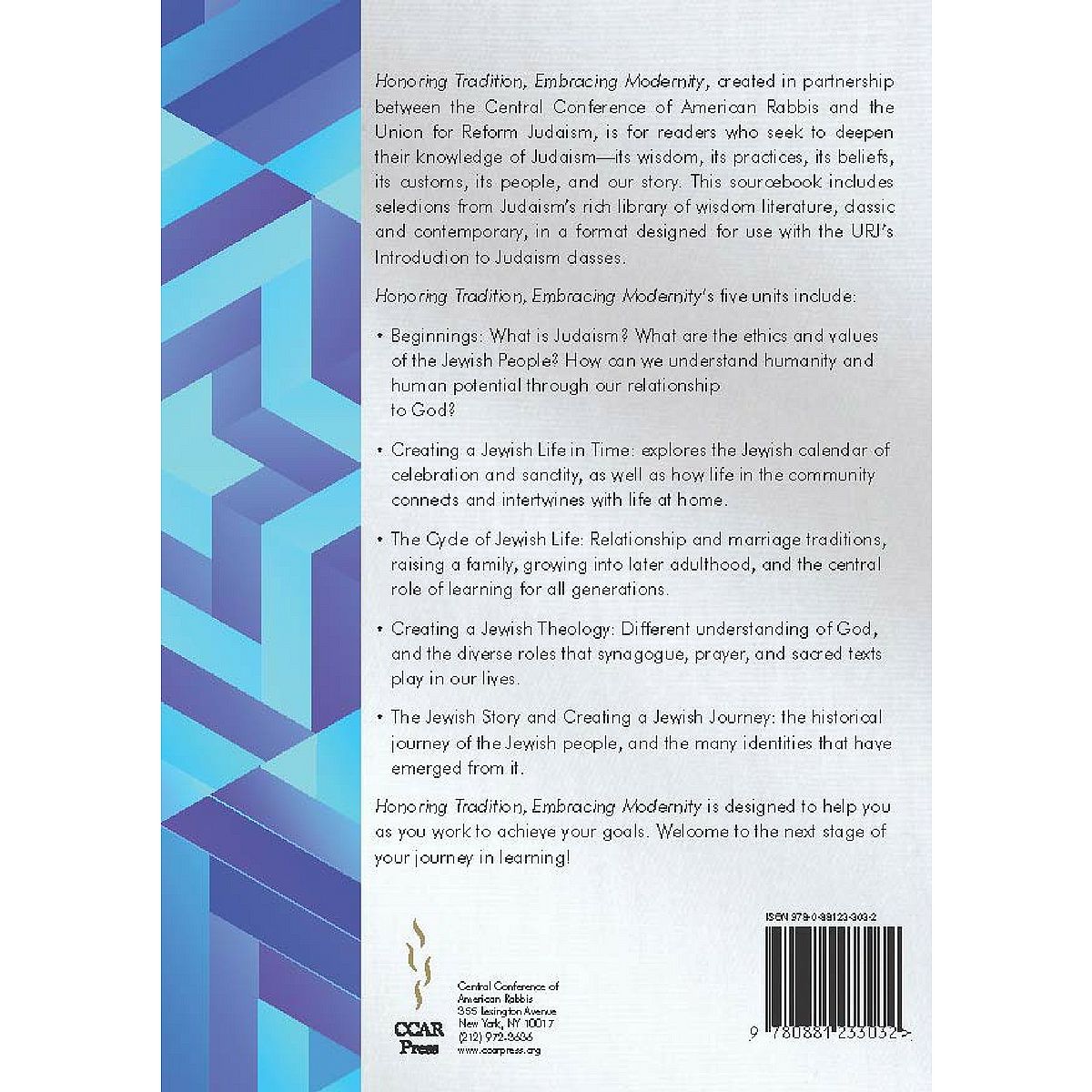Honoring Tradition, Embracing Modernity, created in partnership between the Central Conference of American Rabbis and the Union for Reform Judaism, is for readers who seek to deepen their knowledge of Judaism--its wisdom, its practices, its beliefs, its customs, its people, and our story. This sourcebook includes selections from Judaism's rich library of wisdom literature, classic and contemporary, in a format designed for use with the URJ's Introduction to Judaism classes.