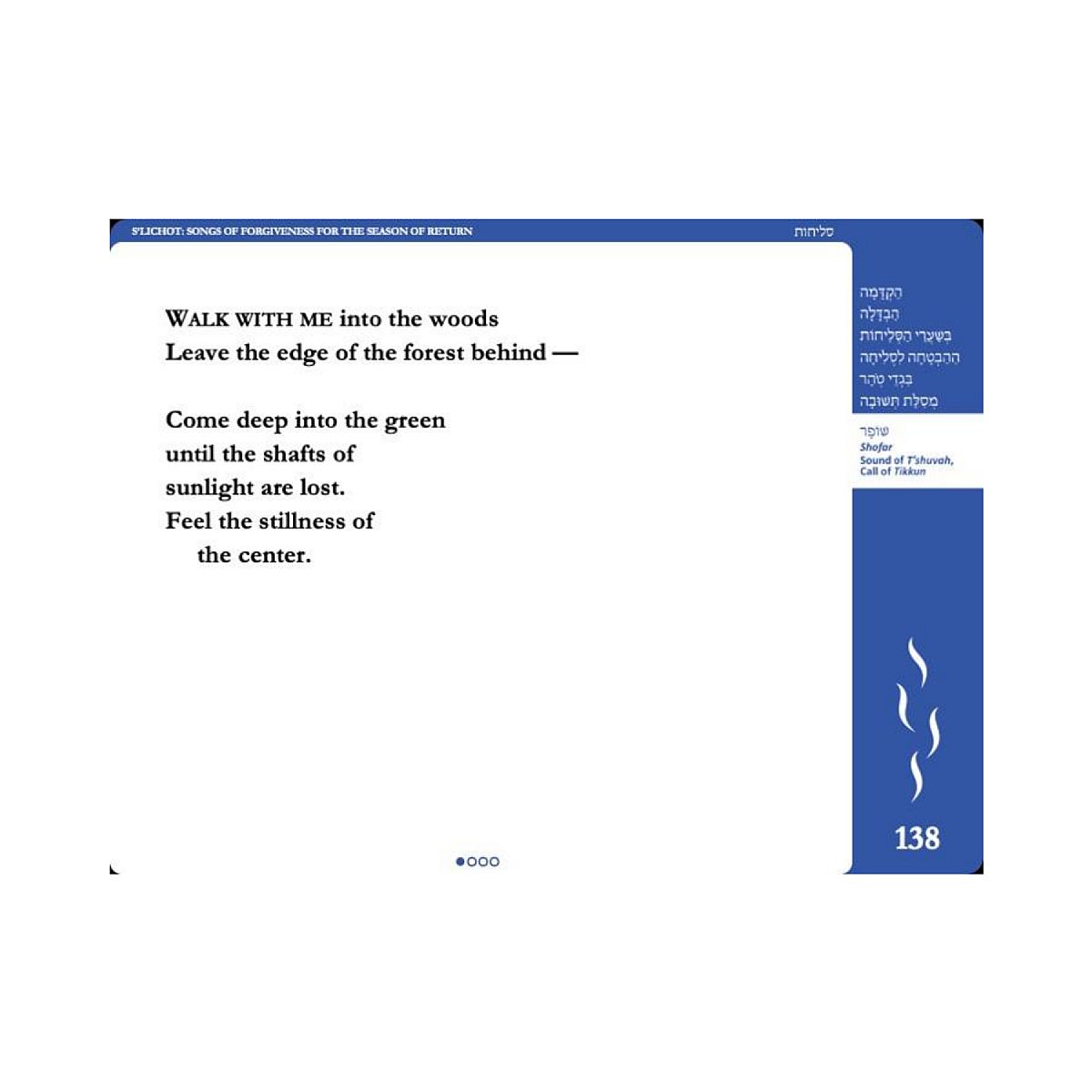 Mishkan HaLev: Prayers for S'lichot and the Month of Elul offers two complete services, one for Erev Shabbat during the month of Elul, and a S'lichot service. Like the new machzor, Mishkan HaLev is full of beautiful readings, poetry, meditations, commentary, and translations to ready the heart and the mind to enter the High Holy Days. Fully transliterated.