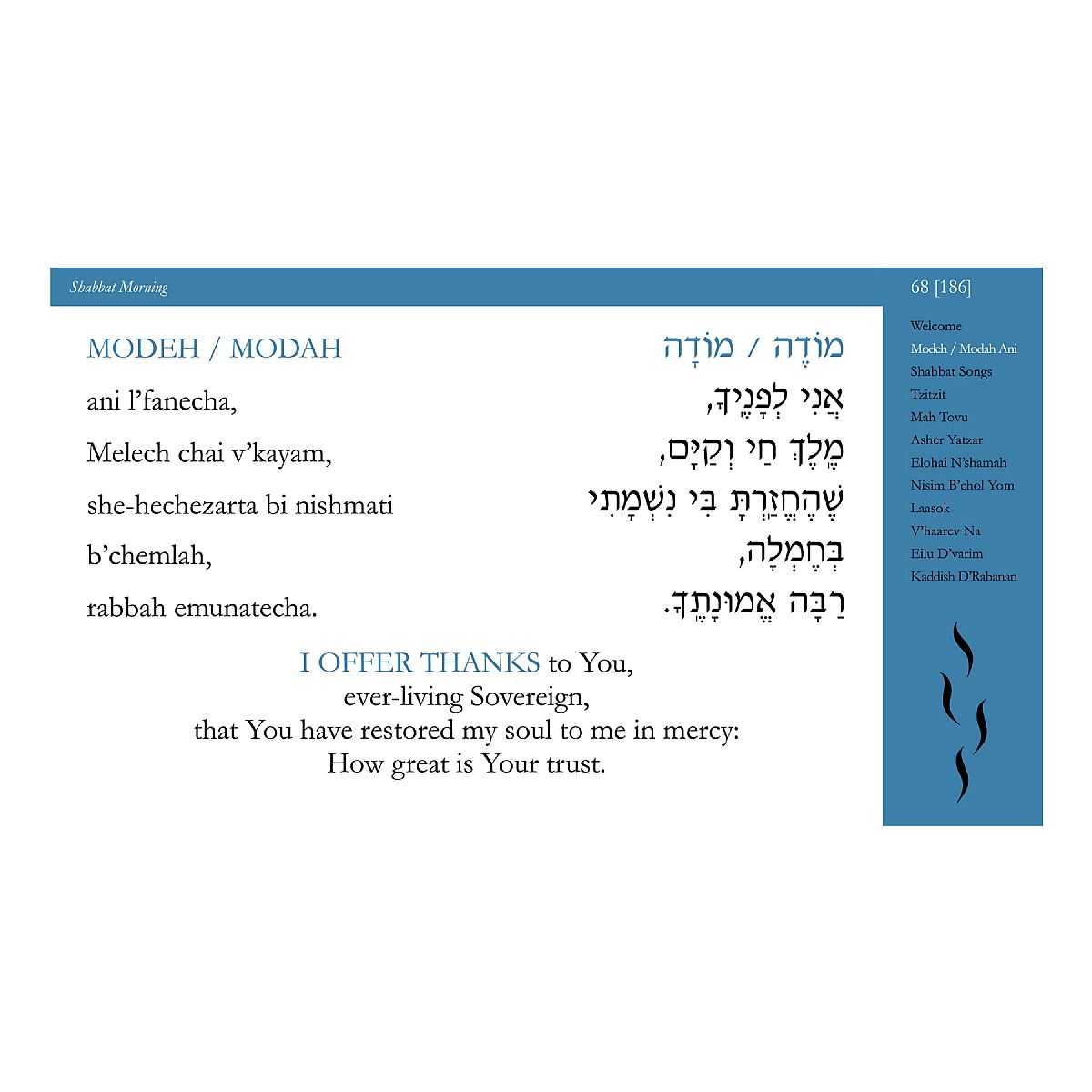 Shabbat Morning Visual T'filahTM comprises the full Shabbat morning liturgy including the Torah service. The Visual T'filah also Includes the following closing songs: Adon Olam, Ein k'Eloheinu, and Shalom Aleichem.