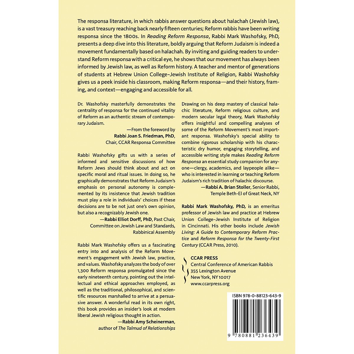 There is no one more qualified to take on this analysis than the author, Rabbi Mark Washofsky. ... Washofsky presents a compelling and important vision of the intellectual underpinnings of Progressive Jewish life: a vision of our Judaism as scholarly and informed, committed to both personal autonomy and the detail of Jewish life, one in which we firmly claim the full breadth of our rich textual heritage as our own.