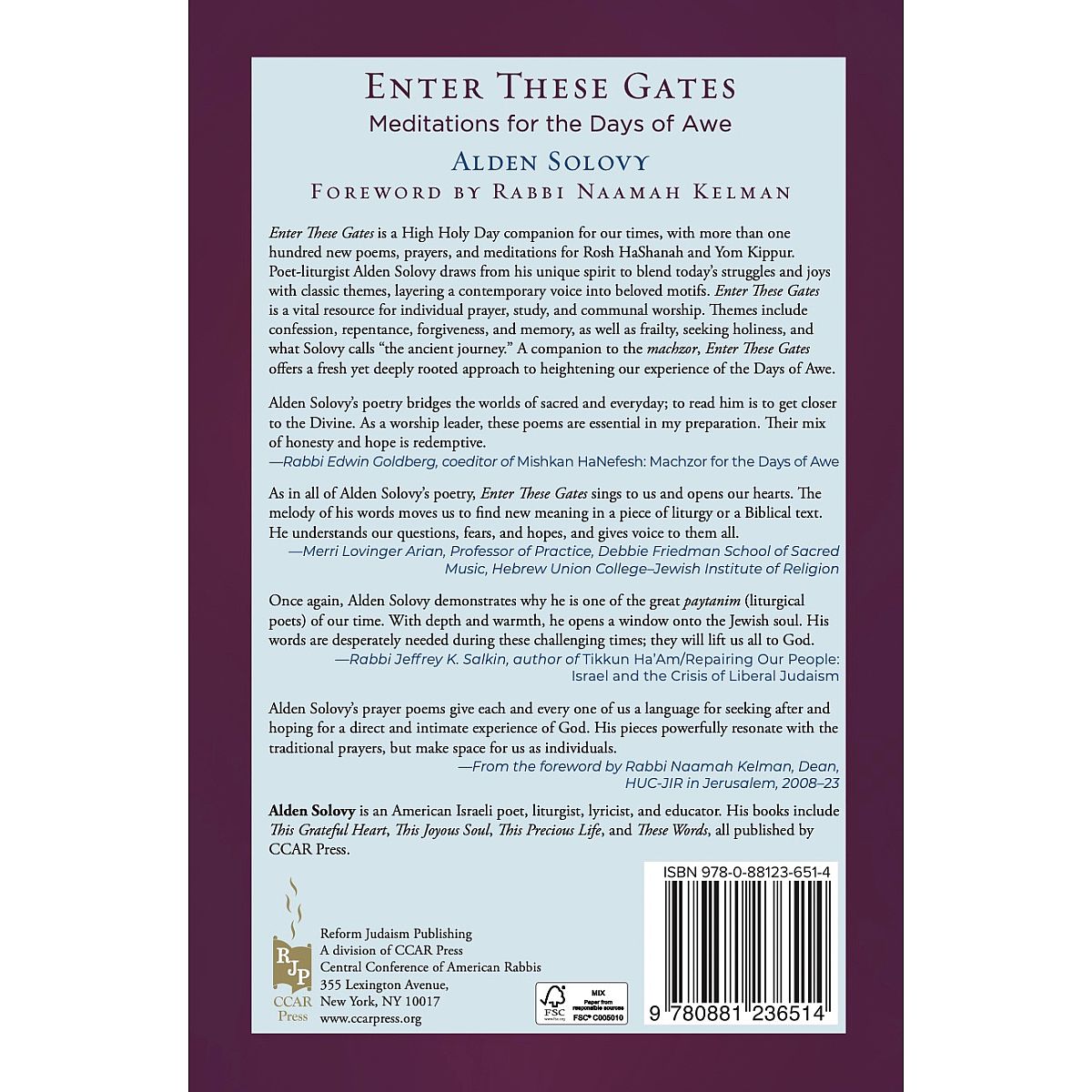To encounter Alden Solovy's work is to experience Judaism itself as if for the first time. ... In his latest book, Enter These Gates: Meditations for the Days of Awe, Solovy layers into his poetry something sacred and intentional, wholly original and deeply personal. ... Solovy has blessed us with a beautiful and poignant companion to our own personal journey through Rosh Hashanah and Yom Kippur.