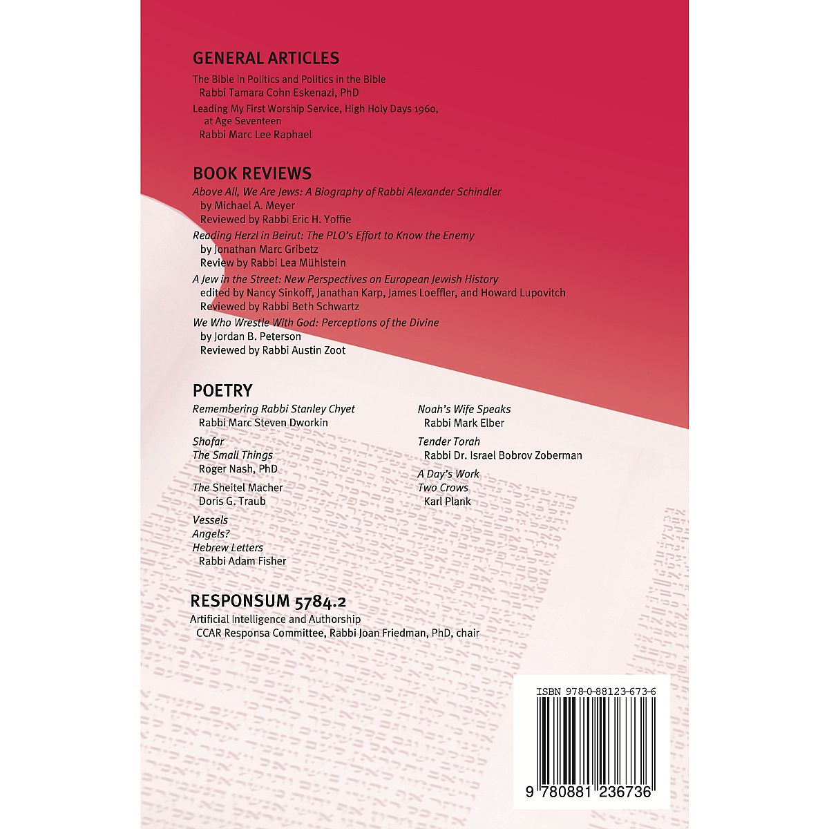 Guest edited by Rabbi Geoffrey A. Mitelman and Rabbanit Sara Tillinger Wolkenfeld, this issue of CCAR Journal explores the rapidly evolving intersection of artificial intelligence and the rabbinate. Through a range of reflective articles, contributors examine how AI is shaping Jewish life, leadership, and ethical discourse. The issue also contains general articles, new book reviews, and poetry.