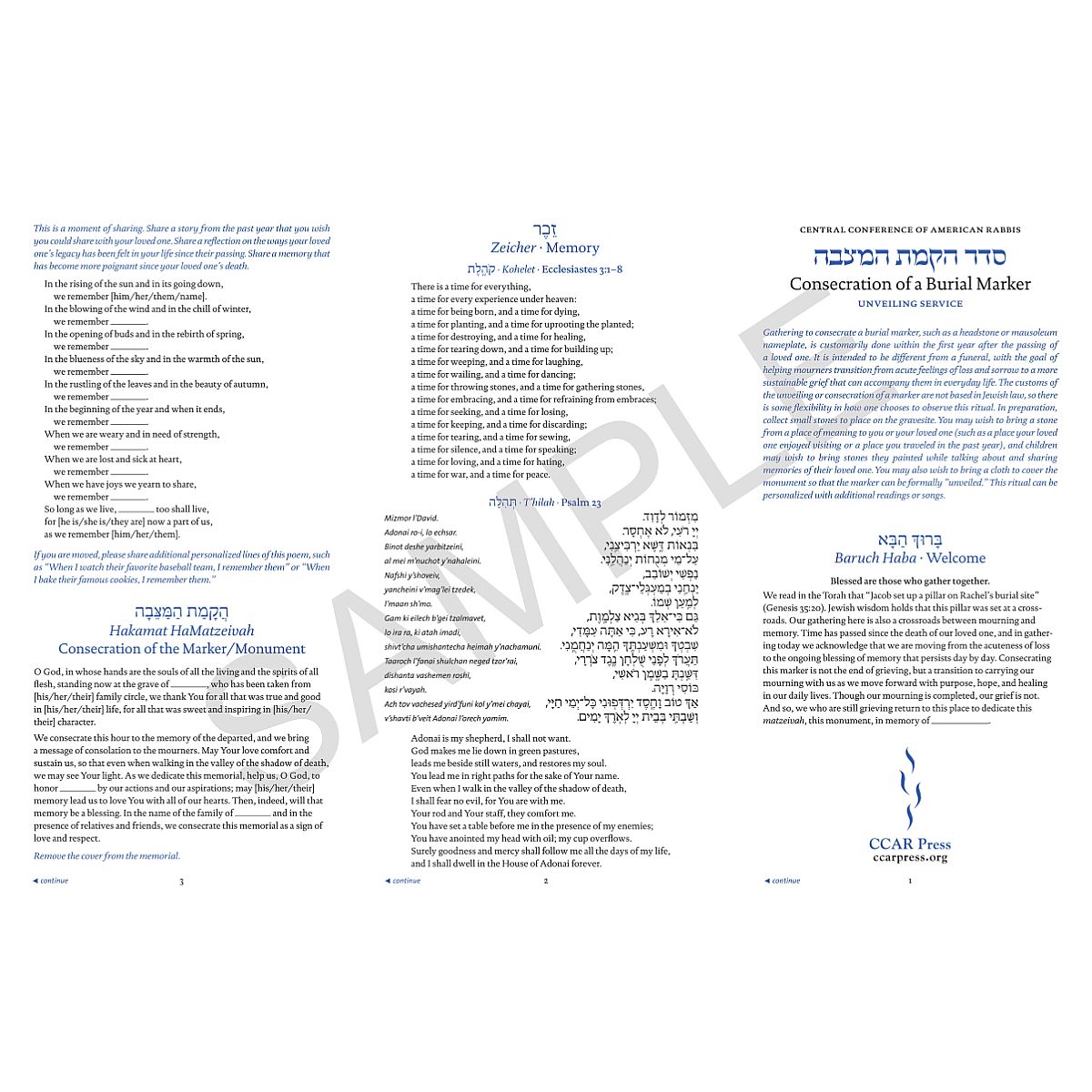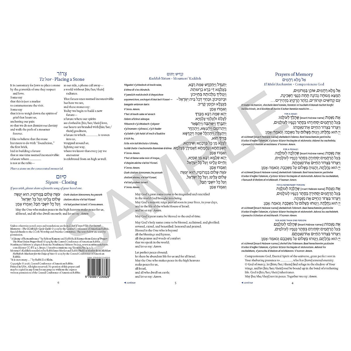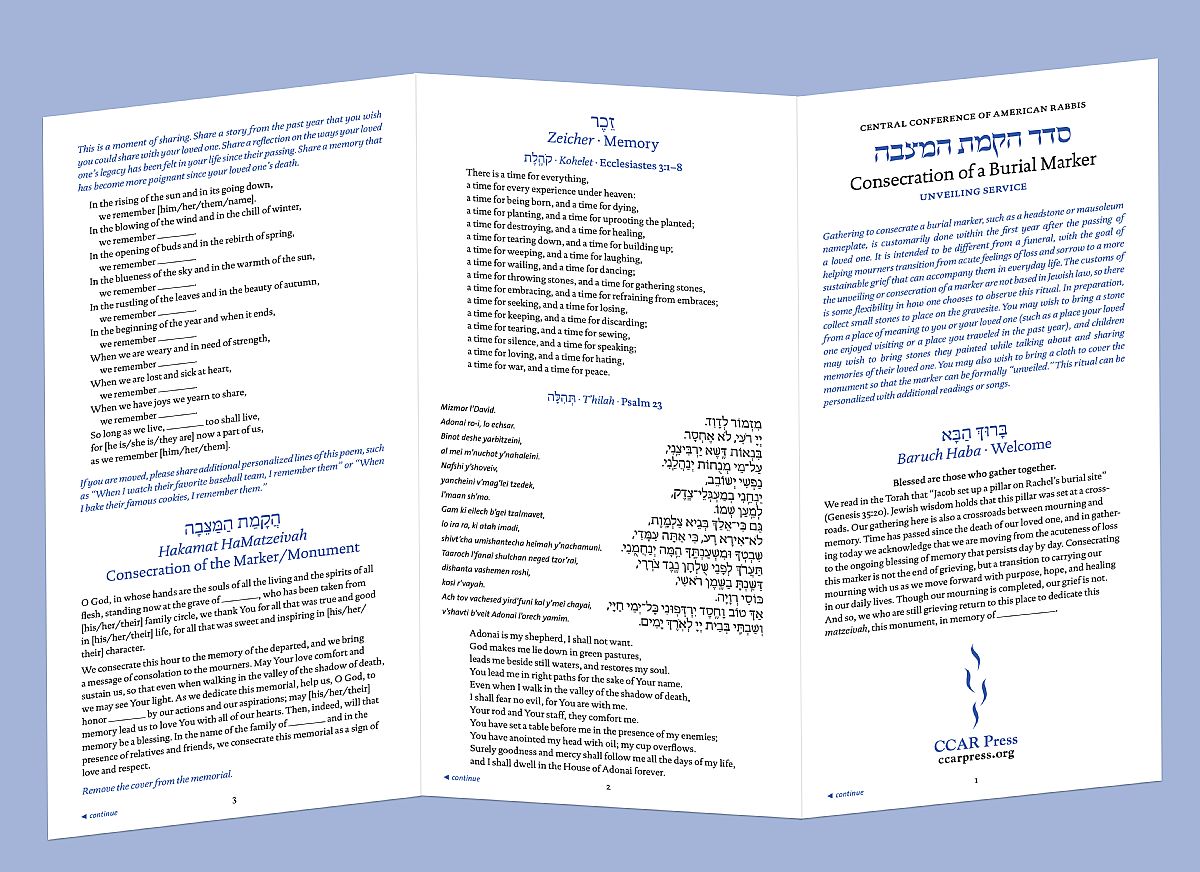 This Z-fold, laminated pamphlet offers prayers, readings, and rituals to comfort the bereaved at an unveiling service to consecrate a burial marker. Designed for use by both clergy and laypeople, it includes traditional and contemporary texts in a beautiful layout.