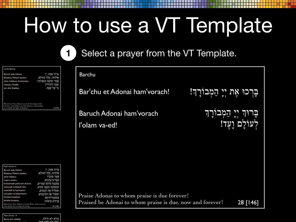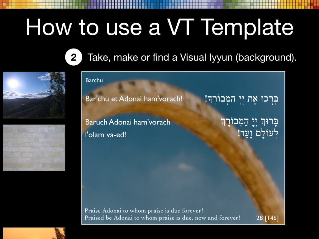 A Visual T'filah Template provides you with the complete liturgy for a service (the "right side of the page" from Mishkan T'filah) including the Hebrew, Transliteration, & Translation formatted for the screen. Simply select which prayers to include in the service and add your own images, Visual Iyyunim, or backgrounds. Please note that this includes text only. Images are to be provided by you.