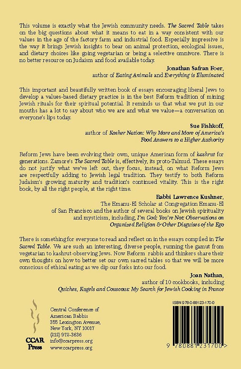"Reform Jews have been evolving their own, unique American form of kashrut for generations. Zamore's The Sacred Table is, effectively, its proto-Talmud. These essays do not justify what we've left out, they focus, instead, on what Reform Jews are respectfully adding to Jewish legal tradition. They testify to both Reform Judaism's growing maturity and tradition's continued vitality. This is the right book, by all the right people, at the right time."