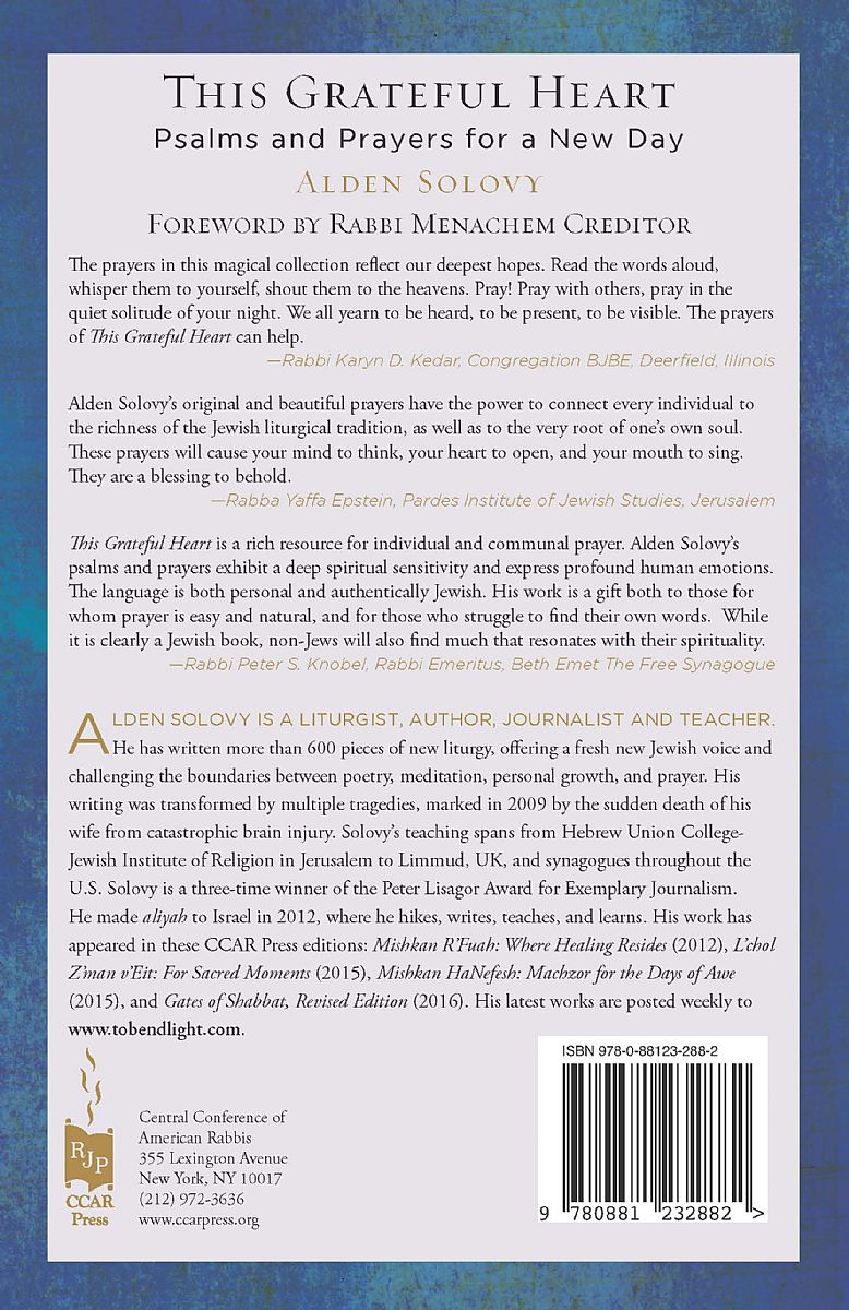 This Grateful Heart is a rich resource for individual and communal prayer. Alden Solovy's psalms and prayers exhibit a deep spiritual sensitivity and express profound human emotions. The language is both personal and authentically Jewish. His work is a gift both to those for whom prayer is easy and natural, and for those who struggle to find their own words. While it is clearly a Jewish book, non-Jews will also find much that resonates with their spirituality.