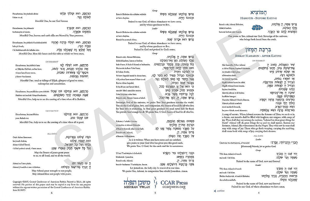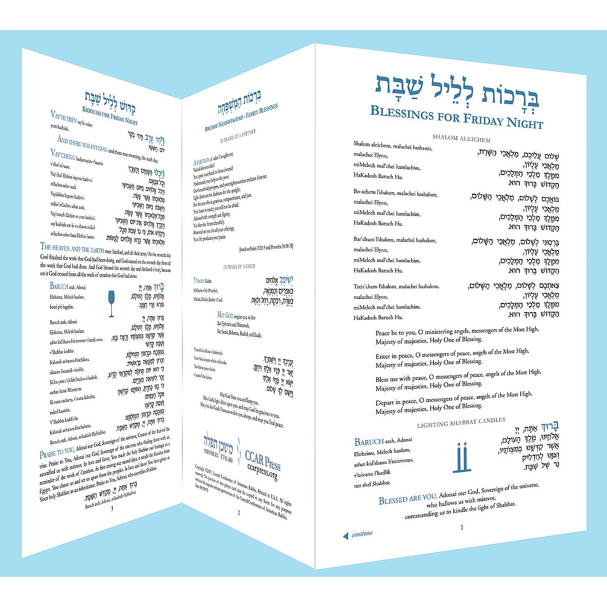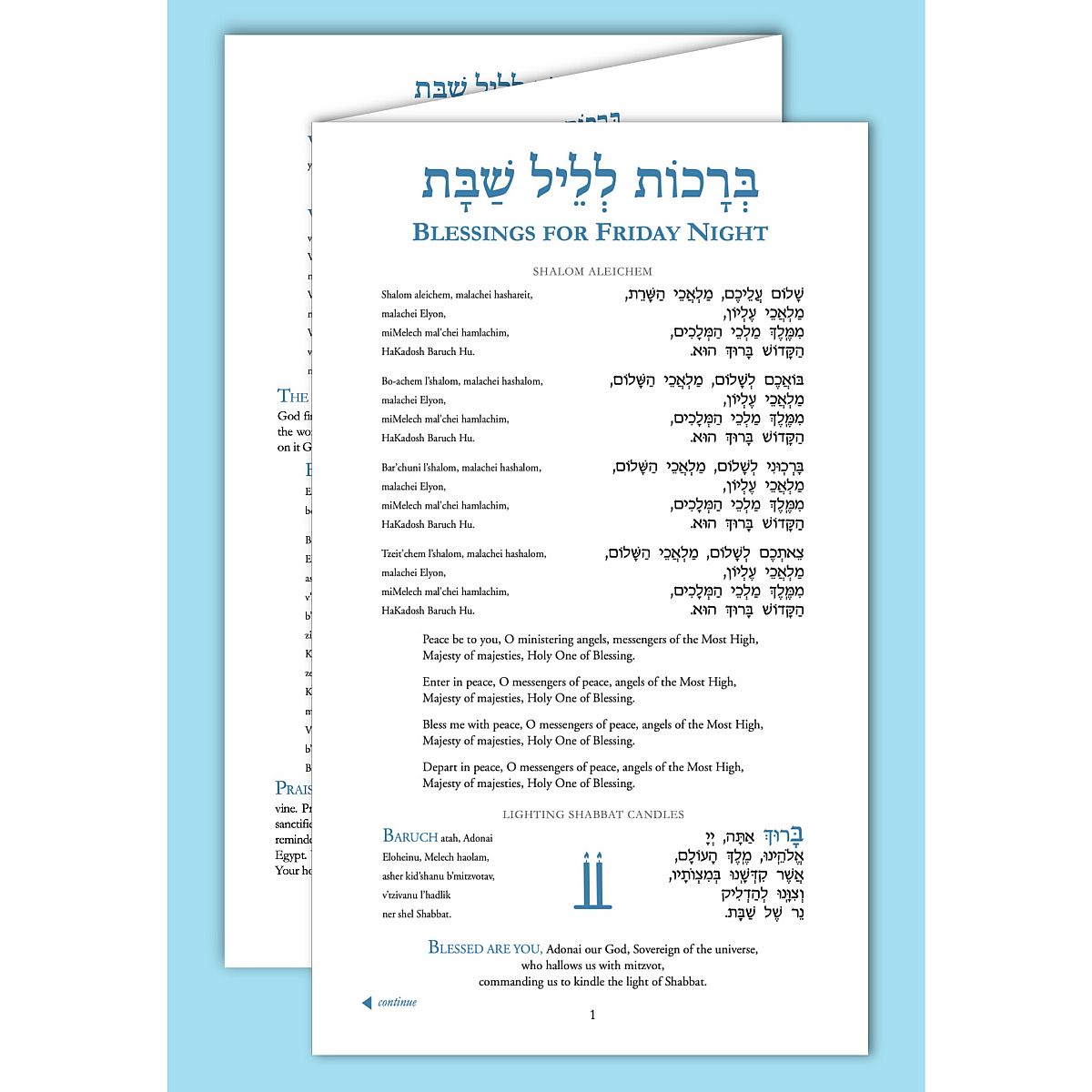 Our Shabbat Table Card fits on the table of every Jewish family. It includes the text of Shalom Aleichem, the blessing for lighting candles, a blessing for a partner, a blessing for children, and the complete Kiddush and Motzi . For the end of a Friday night dinner, the Shabbat Table Card provides the text of the short version of Birkat HaMazon, as it is prayed, sung, and said within the Reform Movement.