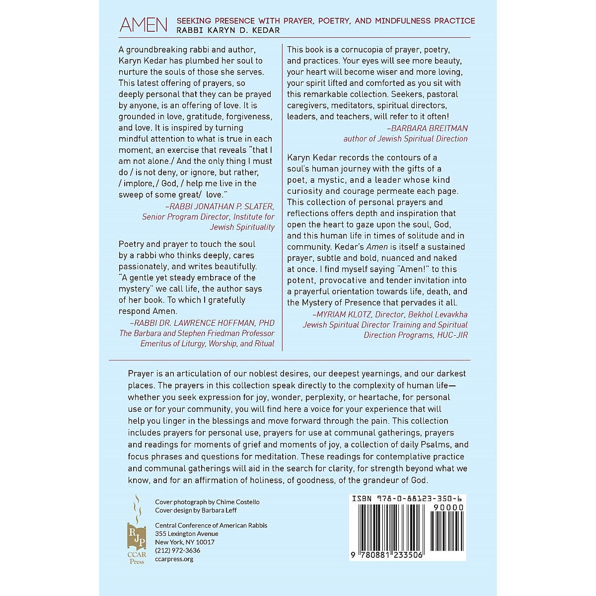 "Karyn Kedar records the contours of a soul's human journey with the gifts of a poet, a mystic, and a leader whose kind curiosity and courage permeate each page. This collection of personal prayers and reflections offers depth and inspiration that open the heart to gaze upon the soul, God, and this human life in times of solitude and in community. Kedar's Amen is itself a sustained prayer, subtle and bold, nuanced and naked at once. I find myself saying "Amen!" to this potent, provocative, and tender invitation into a prayerful orientation towards life, death, and the Mystery of Presence that pervades it all." - Rabbi Myriam Klotz, Director, Bekhol Levavkha Jewish Spiritual Director, Training and Spiritual Direction Programs, HUC-JIR