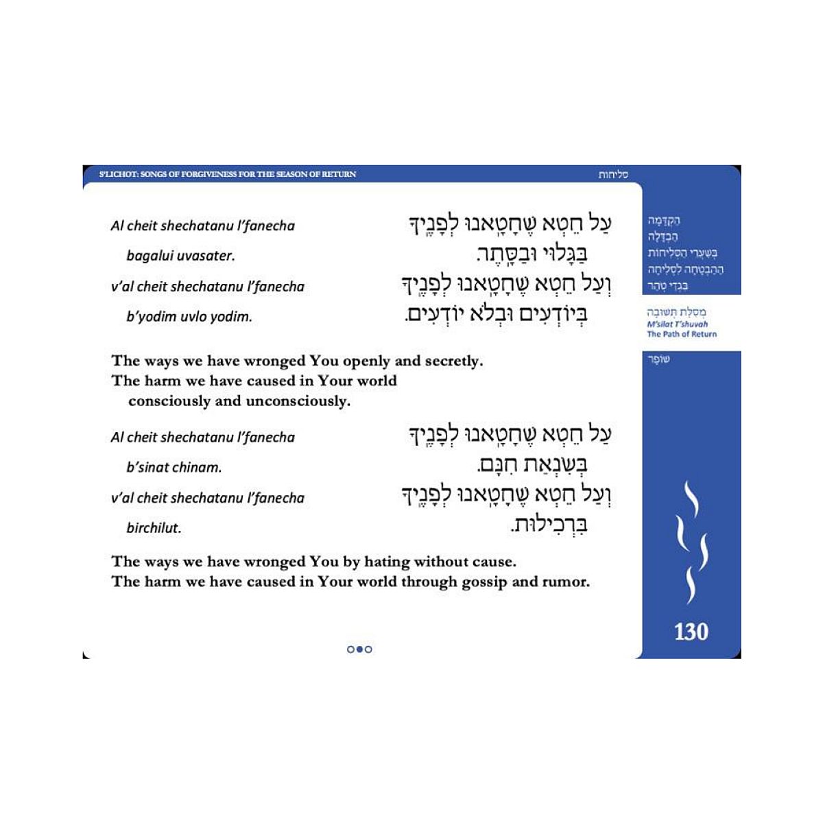 Mishkan HaLev: Prayers for S'lichot and the Month of Elul offers two complete services, one for Erev Shabbat during the month of Elul, and a S'lichot service. Like the new machzor, Mishkan HaLev is full of beautiful readings, poetry, meditations, commentary, and translations to ready the heart and the mind to enter the High Holy Days. Fully transliterated.