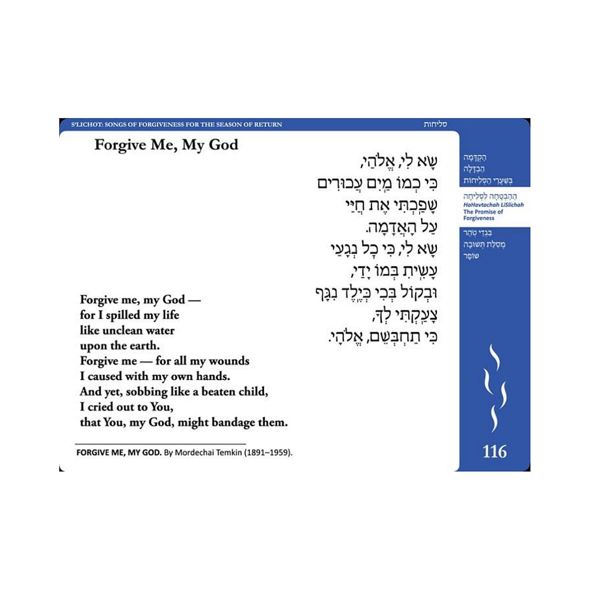 Mishkan HaLev: Prayers for S'lichot and the Month of Elul offers two complete services, one for Erev Shabbat during the month of Elul, and a S'lichot service. Like the new machzor, Mishkan HaLev is full of beautiful readings, poetry, meditations, commentary, and translations to ready the heart and the mind to enter the High Holy Days. Fully transliterated.