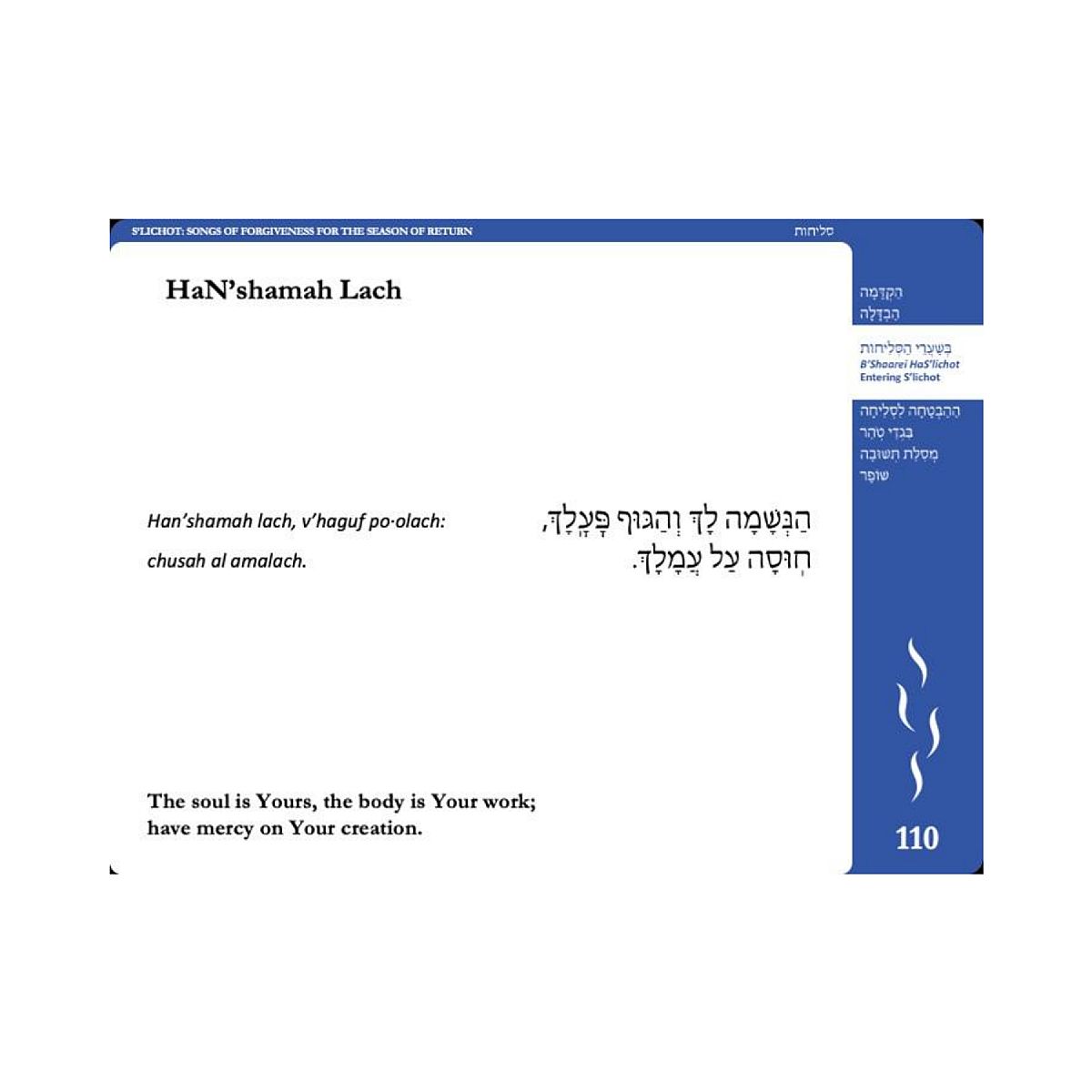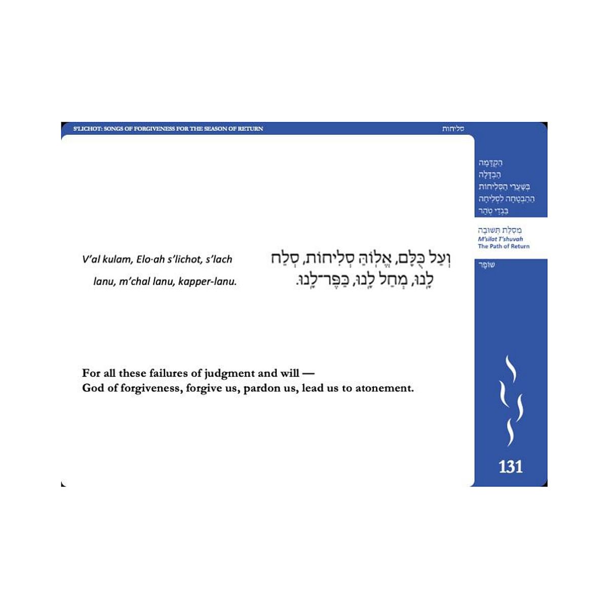 Mishkan HaLev: Prayers for S'lichot and the Month of Elul offers two complete services, one for Erev Shabbat during the month of Elul, and a S'lichot service. Like the new machzor, Mishkan HaLev is full of beautiful readings, poetry, meditations, commentary, and translations to ready the heart and the mind to enter the High Holy Days. Fully transliterated.