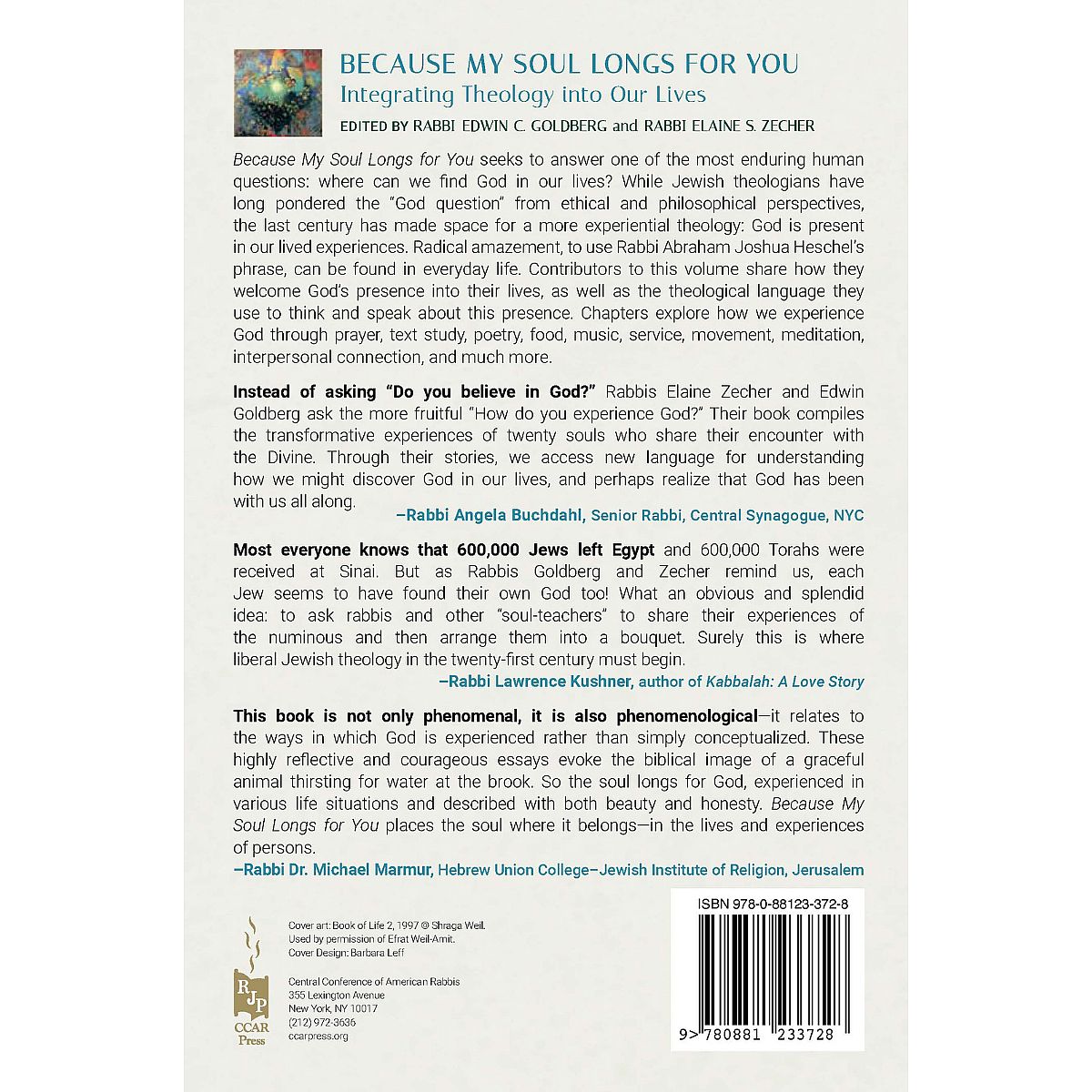Because My Soul Longs for You seeks to answer one of the most enduring human questions: Where can we find God in our lives? While Jewish theologians have long pondered the "God question" from ethical and philosophical perspectives, the last century has made space for a more experiential theology: God is present in our lived experiences. Radical amazement, to use Rabbi Abraham Joshua Heschel's phrase, can be found in everyday life. Contributors to this volume share how they welcome God's presence into their lives, as well as the theological language they use to think and speak about this presence. Chapters explore how we experience God through prayer, text study, poetry, food, music, service, movement, meditation, interpersonal connection, and much more.