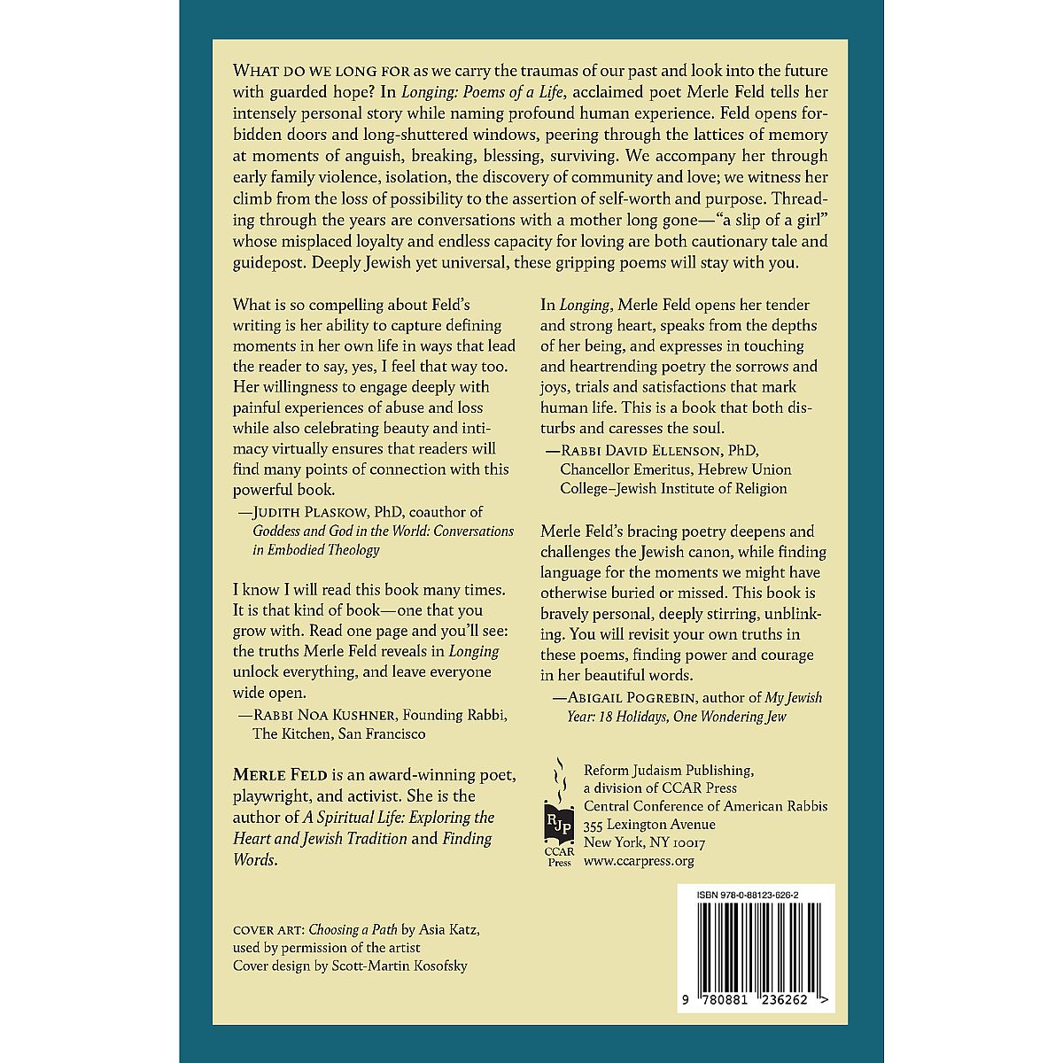 What do we long for as we carry the traumas of our past and look into the future with guarded hope? In Longing: Poems of a Life, acclaimed poet Merle Feld tells her intensely personal story while naming profound human experience. Feld opens forbidden doors and long-shuttered windows, peering through the lattices of memory at moments of anguish, breaking, blessing, surviving. We accompany her through early family violence, isolation, the discovery of community and love; we witness her climb from the loss of possibility to the assertion of self-worth and purpose. Threading through the years are conversations with a mother long gone--"a slip of a girl" whose misplaced loyalty and endless capacity for loving are both cautionary tale and guidepost. Deeply Jewish yet universal, these gripping poems will stay with you.