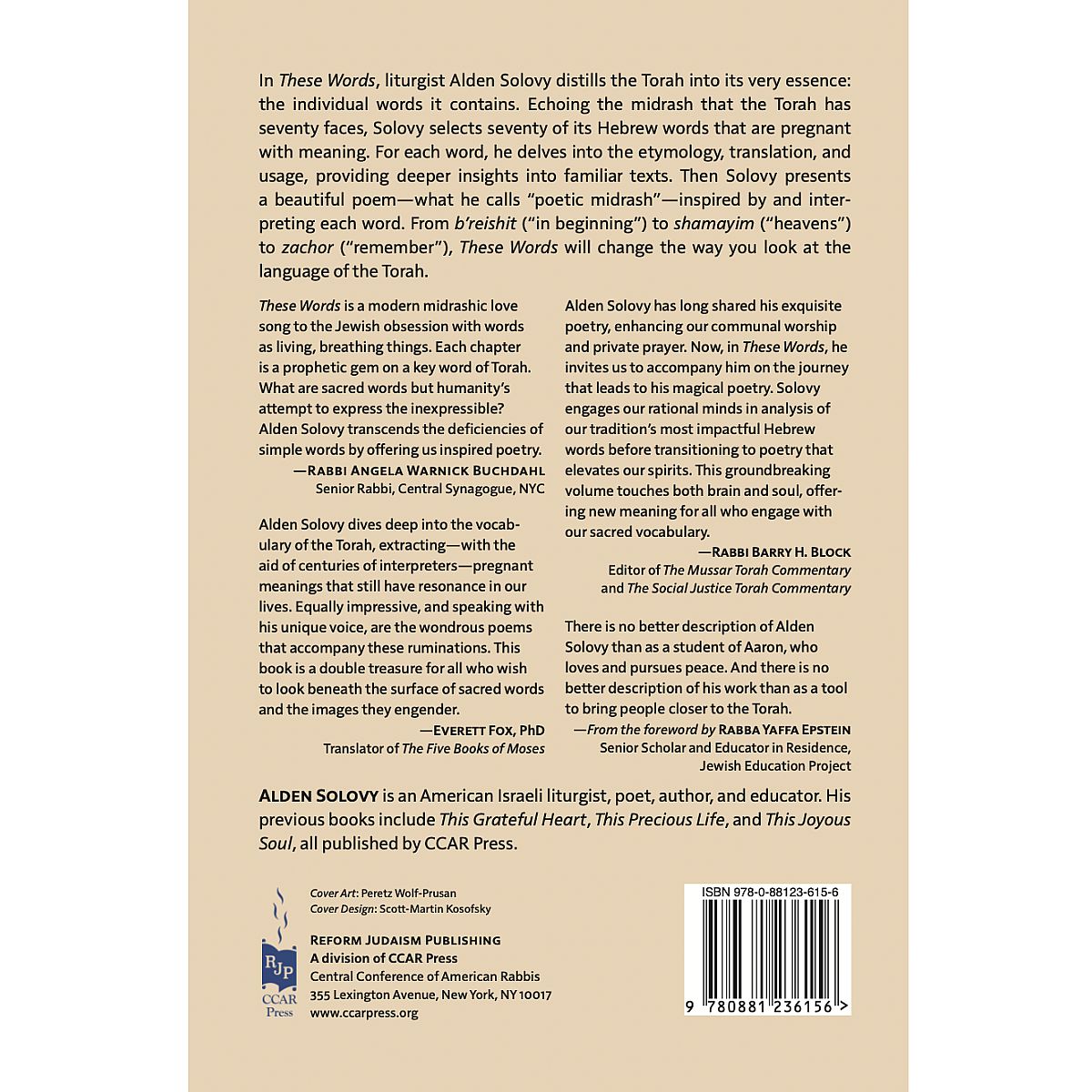 In These Words, liturgist Alden Solovy distills the Torah into its very essence: the individual words it contains. Echoing the midrash that the Torah has seventy faces, Solovy selects seventy of its Hebrew words that are pregnant with meaning. For each word, he delves into the etymology, translation, and usage, providing deeper insights into familiar texts. Then Solovy presents a beautiful poem--what he calls "poetic midrash"--inspired by and interpreting each word. From b'reishit ("in beginning") to shamayim ("heavens") to zachor ("remember"), These Words will change the way you look at the language of the Torah.