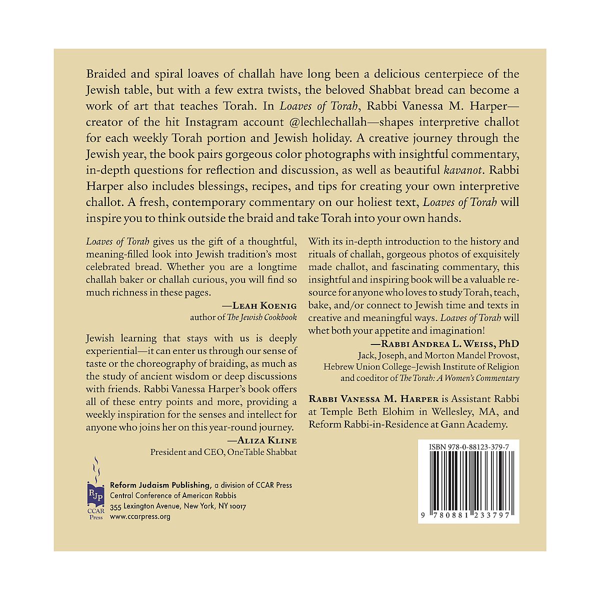 What began as a pandemic project by Rabbi Vanessa Harper has blossomed into a beautiful book that brings the weekly parashah to life in a unique way: through the art of challah. ... Each entry is accompanied by a beautiful photograph of that week's interpretive challah creation, plus a few pages explaining the significance of the parashah. In essence, Rabbi Harper has put a modern spin on ancient Talmudic teachings. This is a book to pick up again and again. Readers can look forward to, and be inspired by, clever creations like two blue, intricately braided challot for Parsha B'shalach, which describes the parting of the Sea of Reeds. Rabbi Harper also challenges us to a kavanah, or weekly intention, encouraging us to find meaning in our week. Just like making challah can be an individual practice---regardless of the fact that we all use the same ingredients---so too is Rabbi Harper pushing us to take each parashah and make it our own.