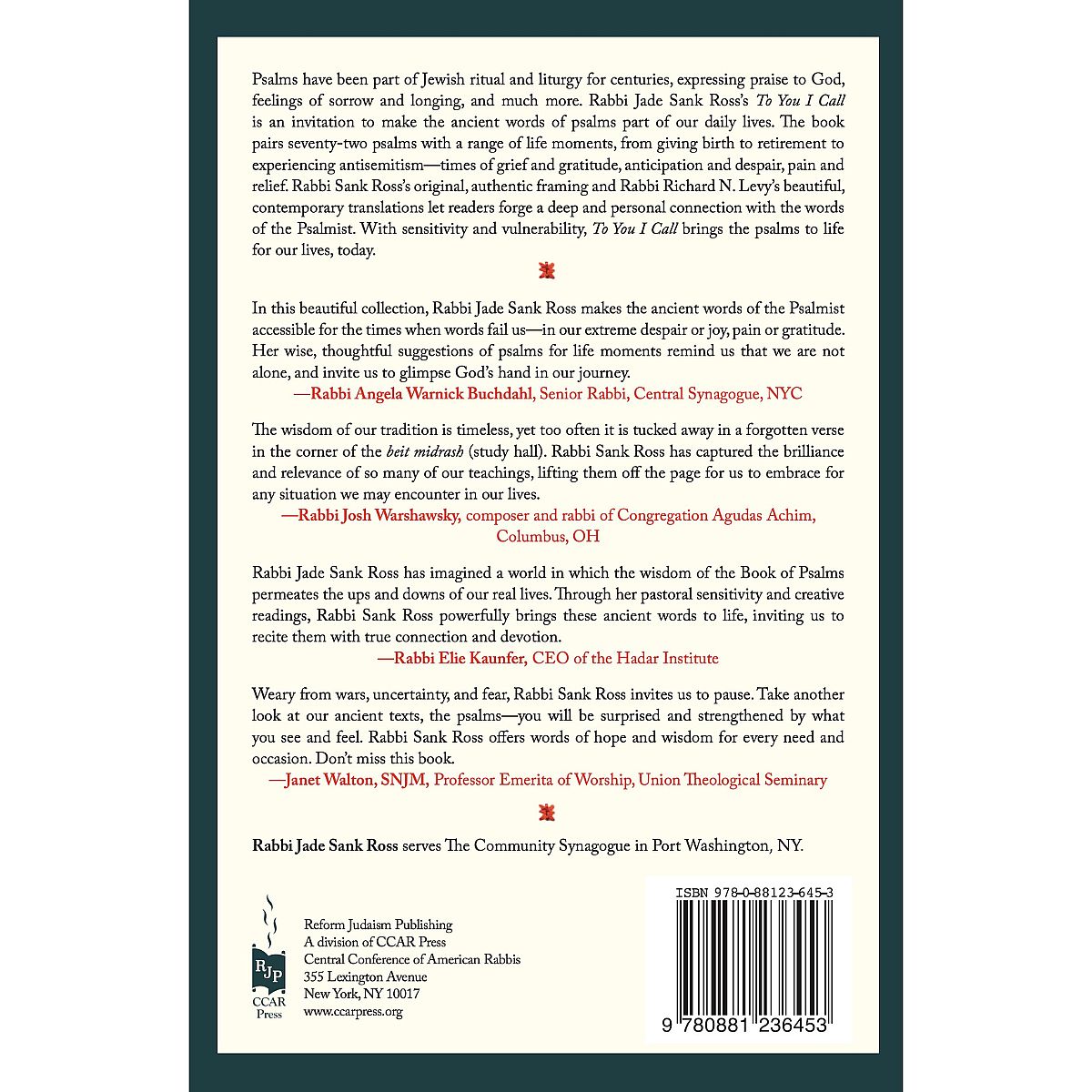 Rabbi Richard N. Levy's modern translation of the psalms makes the ancient words accessible to all readers, both those who are familiar with the text and those who are reading it for the first time. ... To You I Call can be read many times, and each time a reader will find new meanings, interpretations, and connections in the words of the psalms and Rabbi Sank Ross's commentary.