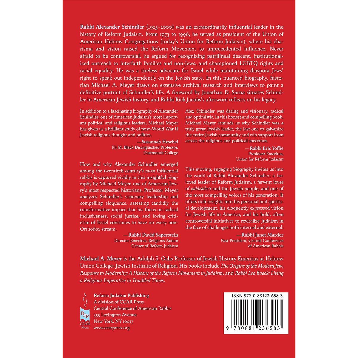 Rabbi Alexander Schindler (1925-2000) was an extraordinarily influential leader in the history of Reform Judaism. From 1973 to 1996, he served as president of the Union of American Hebrew Congregations (today's Union for Reform Judaism), where his charisma and vision raised the Reform Movement to unprecedented influence. Never afraid to be controversial, he argued for recognizing patrilineal descent, institutionalized outreach to interfaith families and non-Jews, and championed LGBTQ rights and racial equality. He was a tireless advocate for Israel while maintaining diaspora Jews' right to speak out independently on the Jewish state. In this nuanced biography, historian Michael A. Meyer draws on extensive archival research and interviews to paint a definitive portrait of Schindler's life. A foreword by Jonathan D. Sarna situates Schindler in American Jewish history, and Rabbi Rick Jacobs's afterword reflects on his legacy.