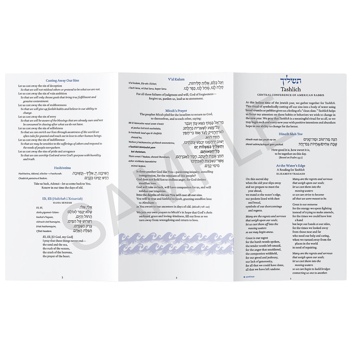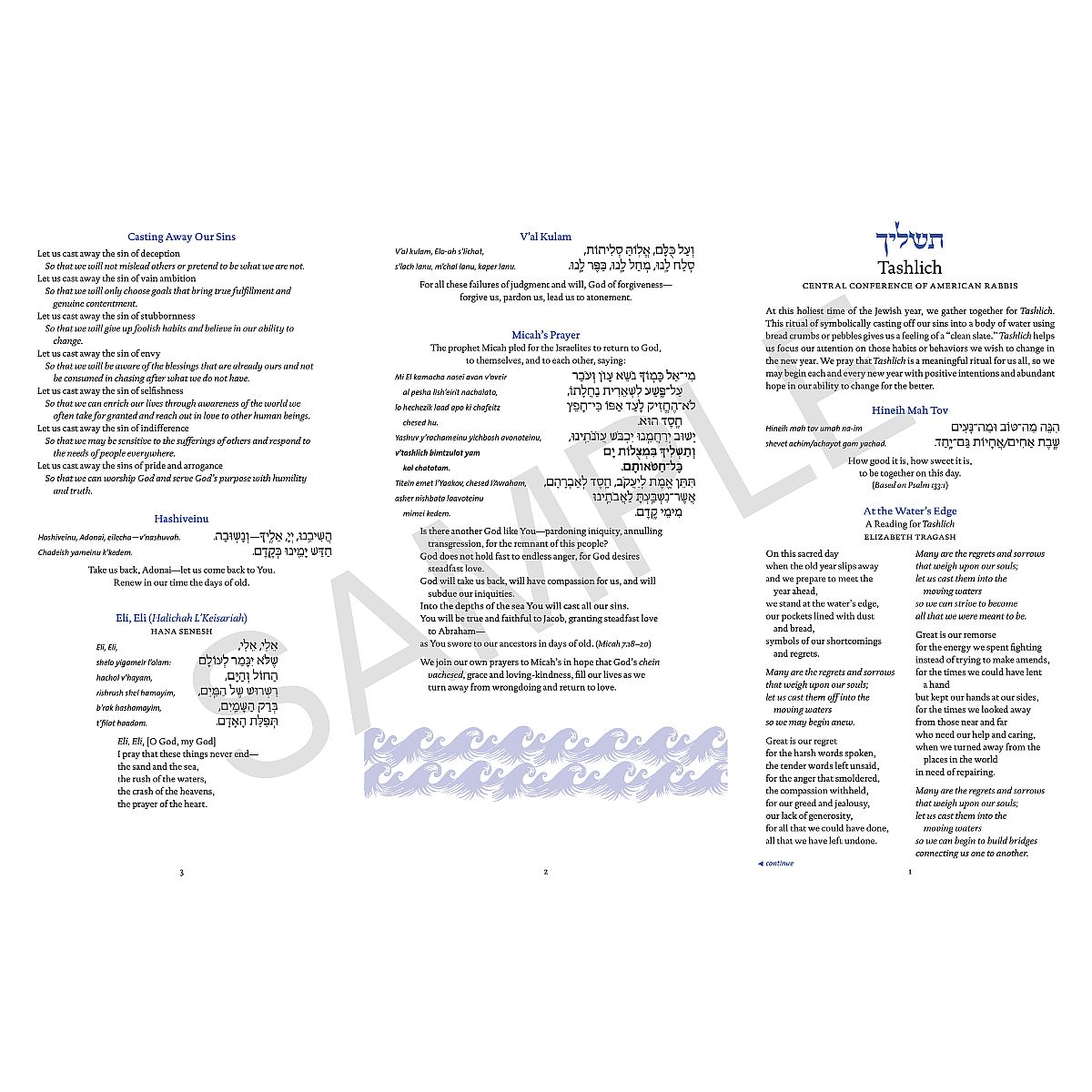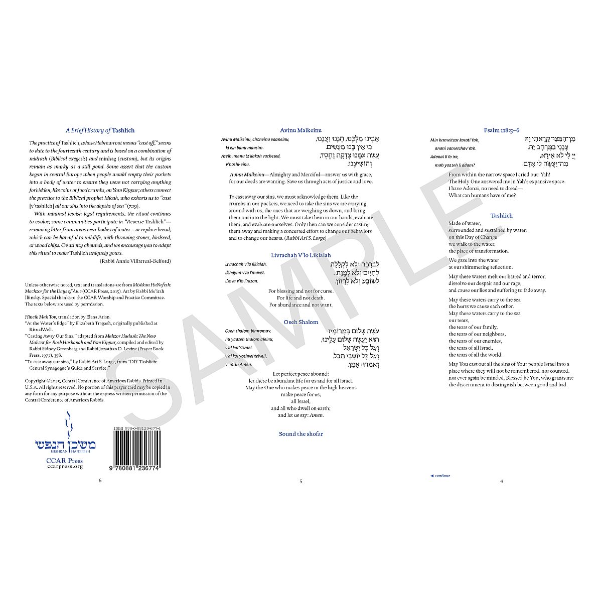 The Tashlich ritual guides us in the spiritual practice of casting away regrets and renewing intention for the Jewish new year. Rediscover the power of Tashlich with the CCAR's service for this beloved High Holy Day tradition. Designed for use by individuals, families, and communities, this beautiful and accessible resource---a Z-fold, laminated companion to Mishkan HaNefesh---features lyrics to seasonal melodies, evocative readings, and cherished prayers, with full translation and transliteration. The card also includes a brief history of the ritual as well as thoughtful suggestions for interpreting it for today's world. The CCAR Tashlich service brings depth, creativity, and relevance to this annual tradition.