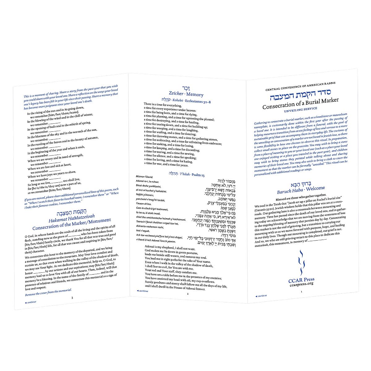 This Z-fold, laminated pamphlet offers prayers, readings, and rituals to comfort the bereaved at an unveiling service to consecrate a burial marker. Designed for use by both clergy and laypeople, it includes traditional and contemporary texts in a beautiful layout.